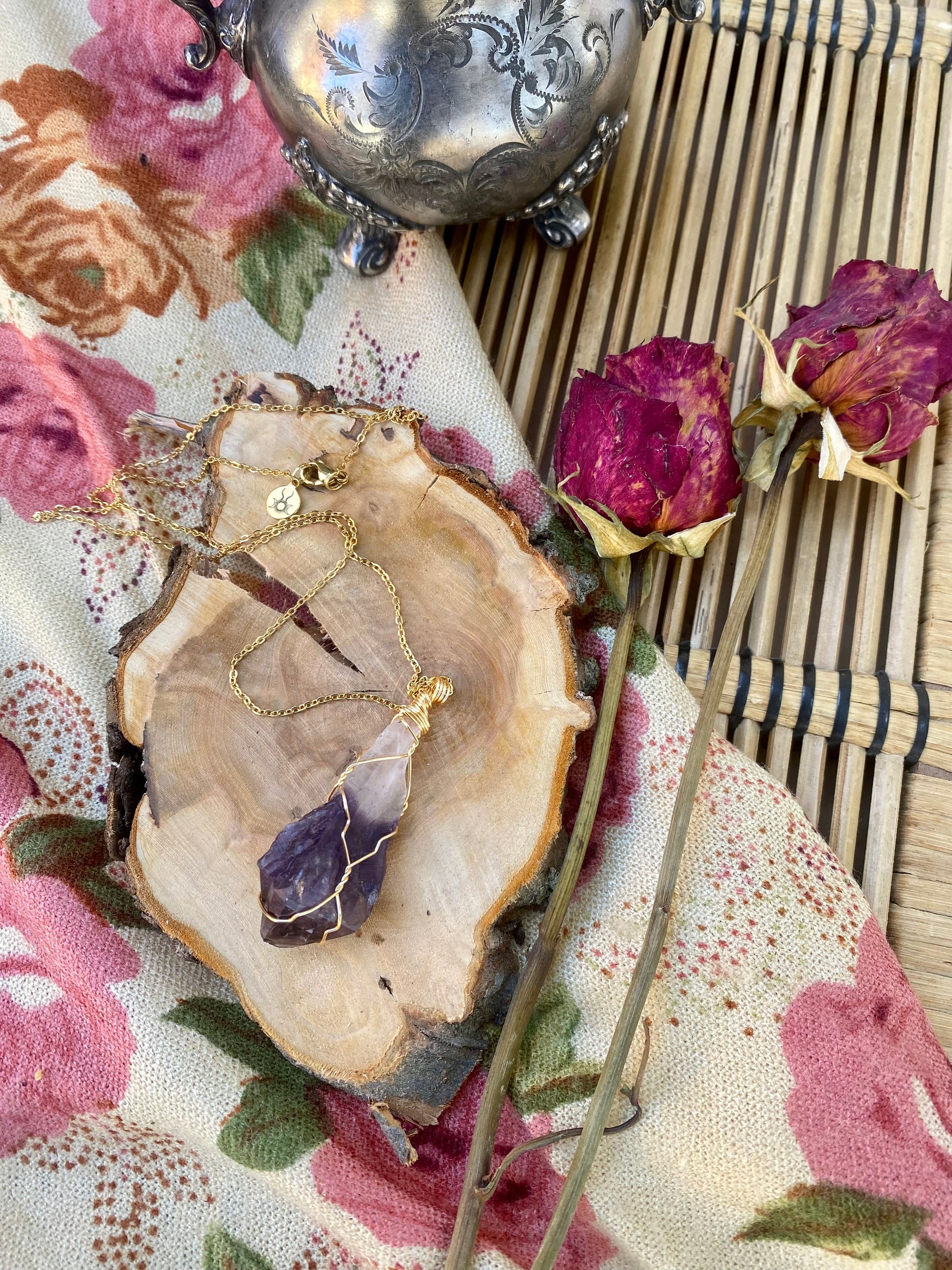 5.5x2.5x2cm Amethyst point in gold on 62cm stainless steel chain.
