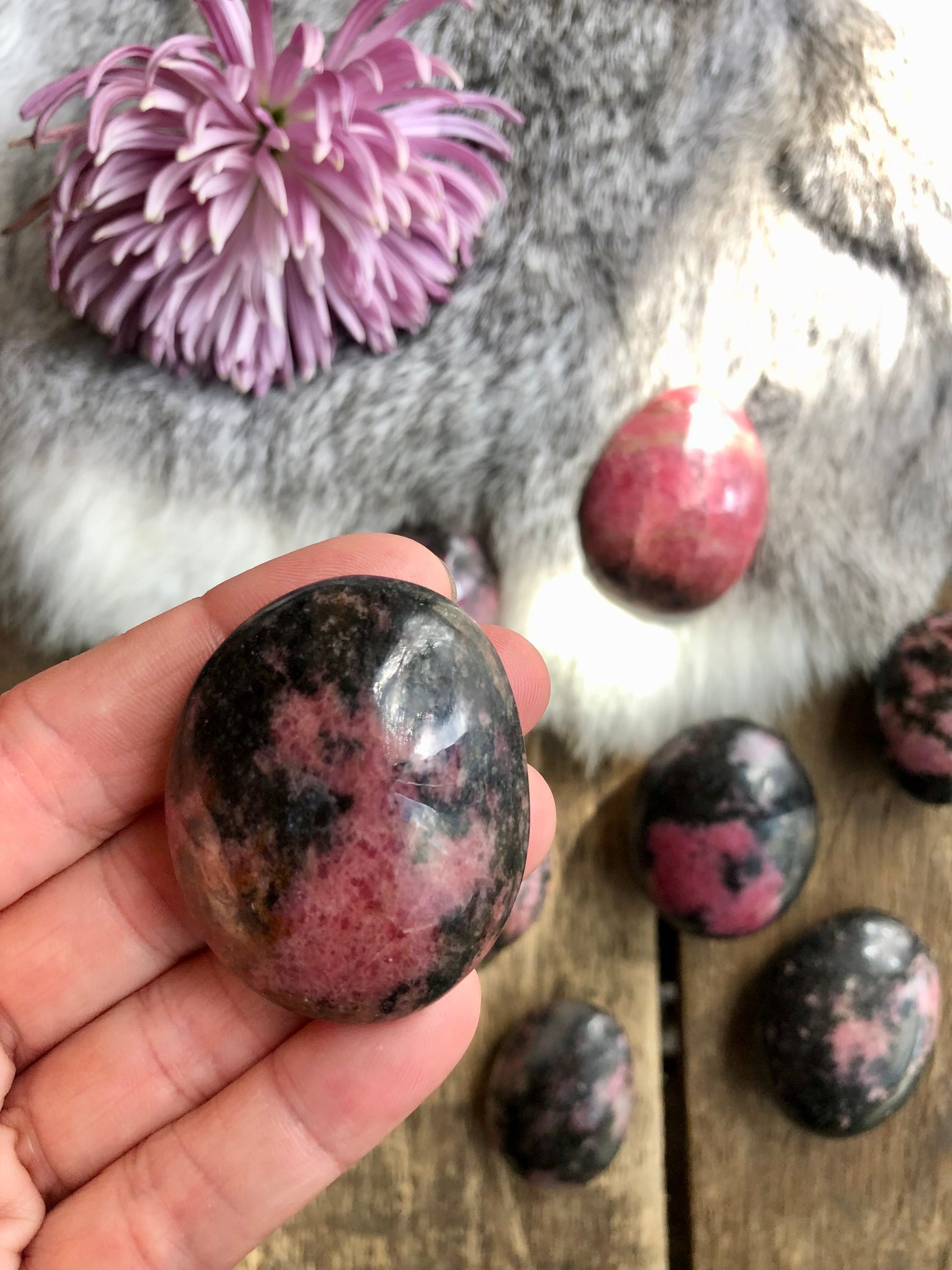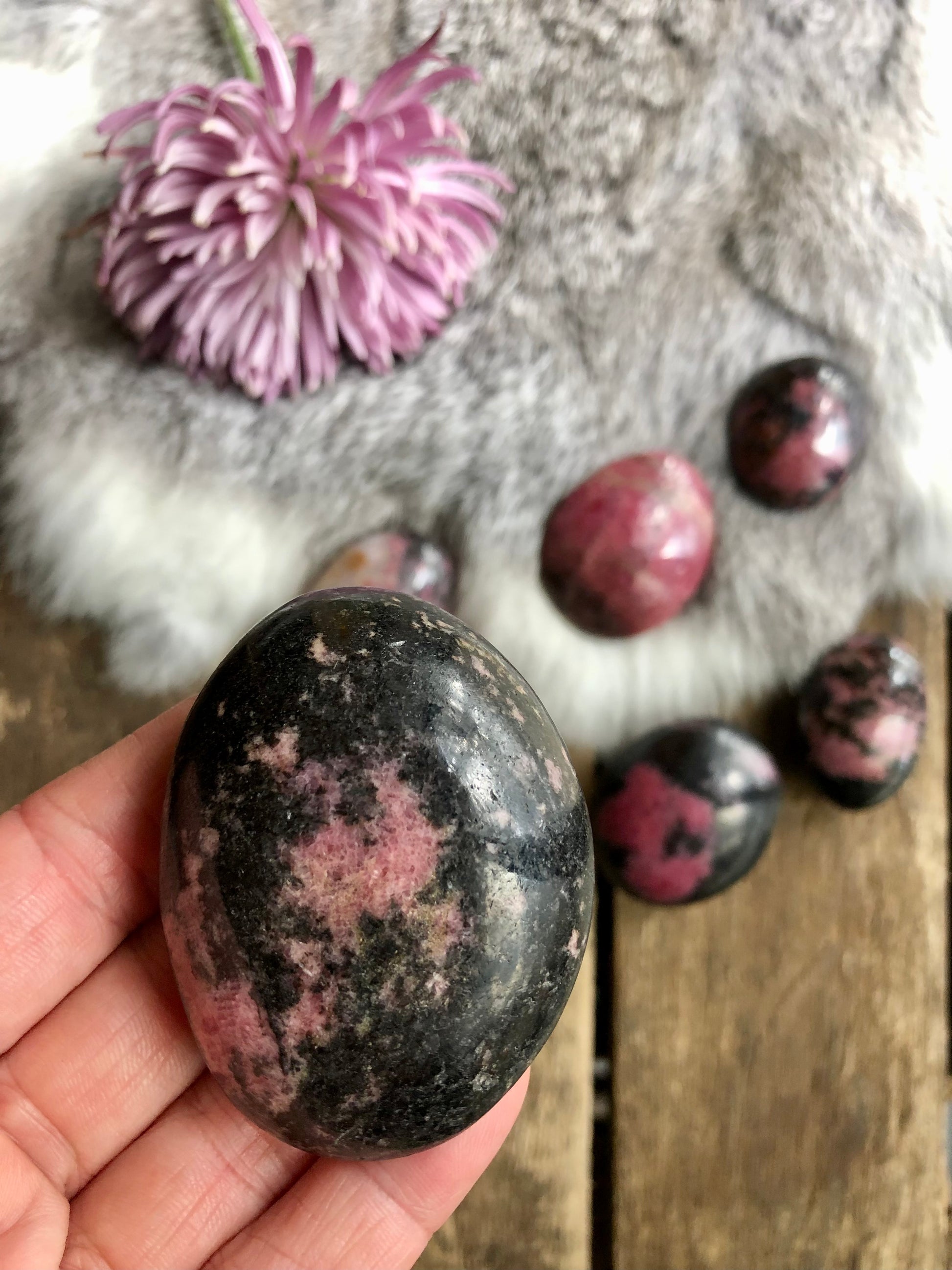 One intuitively chosen Rhodonite palm stone. Approximately 5-6cm.