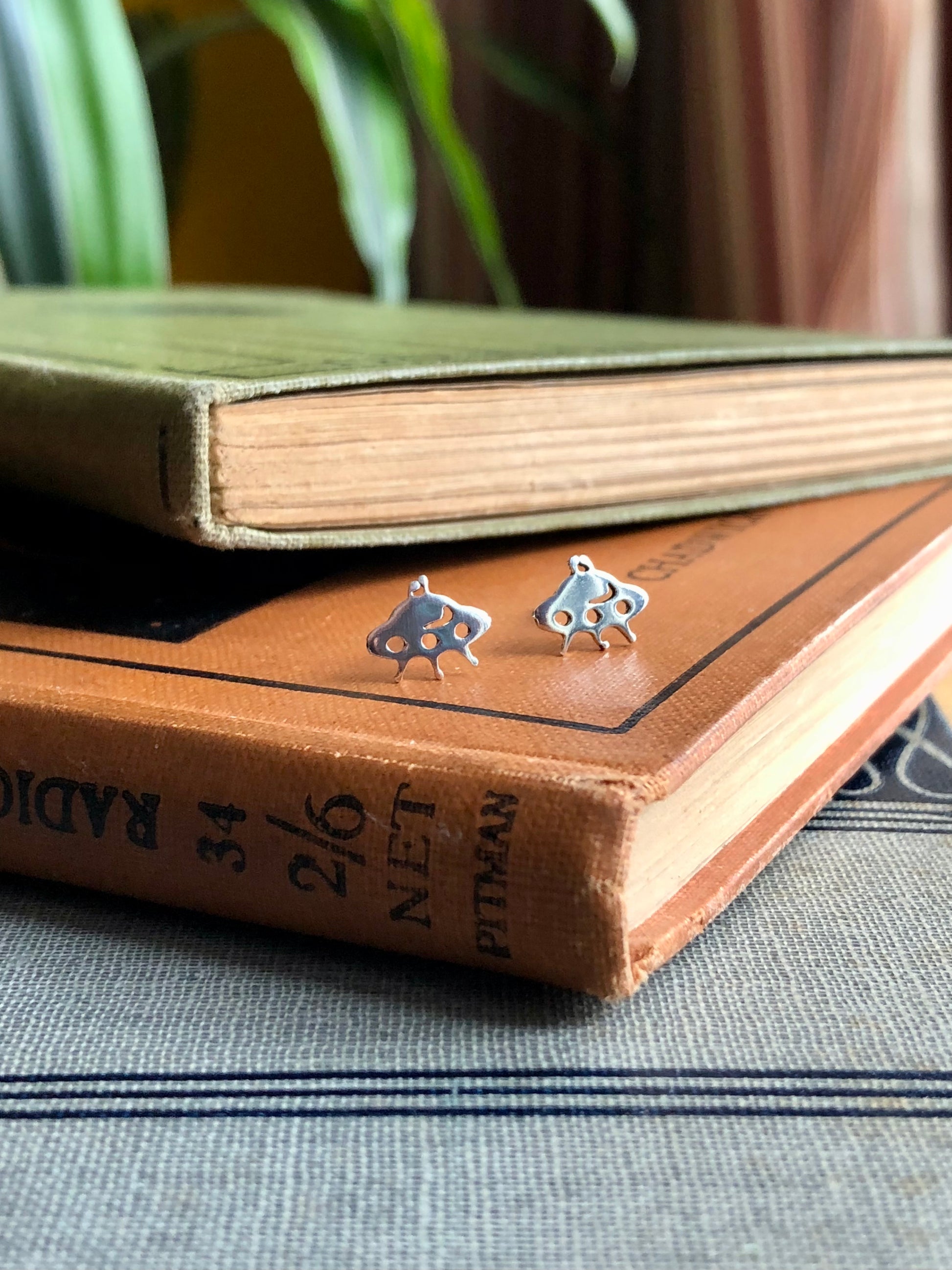 Sterling silver UFO stud earrings with butterfly backs. Approximately 7x9mm.